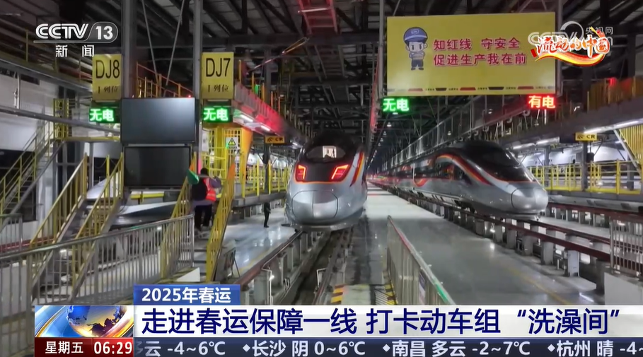 春運期間,旅客平安出行的背后是數(shù)千組奔馳在祖國大江南北的動車組。白天,列車日行千里,而到了午夜時分,它們就進(jìn)入專屬的“保養(yǎng)驛站”進(jìn)行必要的清洗工作。從里到外,保潔員們連夜給列車好好地“洗個澡”,確保次日干凈上線。接下來,我們就跟隨記者的鏡頭一起去到江西南昌,打卡高鐵動車組的“洗澡間”。
