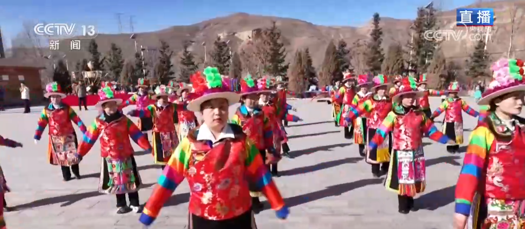 記者來(lái)到班彥村的村口廣場(chǎng)看到,三十多位土族姑娘和小伙子們身穿鮮艷的民族服飾,手挽手肩并肩,跳起土族傳統(tǒng)舞蹈——安召舞,為即將到來(lái)的互助縣農(nóng)歷“二月二”傳統(tǒng)擂臺(tái)廟會(huì)暨“非遺宣傳周”展示活動(dòng)做準(zhǔn)備。歡快的節(jié)奏真的是非常有感染力,每個(gè)人身上似乎都洋溢著火一般的熱情。