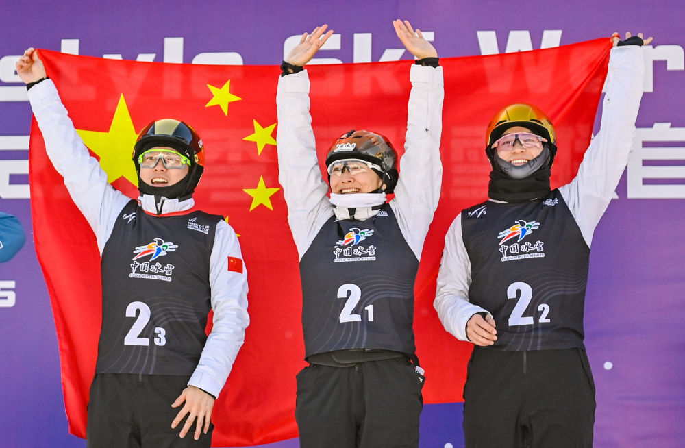 2月24日,在2024-2025賽季國際雪聯(lián)自由式滑雪世界杯(北大湖站)空中技巧混合團體決賽中,由徐夢桃、李天馬、齊廣璞組成的中國一隊獲得金牌。圖為中國一隊徐夢桃(中)、李天馬(右)、齊廣璞在頒獎儀式上。新華社記者 顏麟蘊 攝