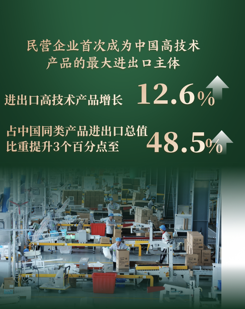 民營企業(yè)首次成為中國高技術(shù)產(chǎn)品的最大進(jìn)出口主體,進(jìn)出口高技術(shù)產(chǎn)品增長12.6%,占中國同類產(chǎn)品進(jìn)出口總值比重提升3個百分點(diǎn)至48.5%。
