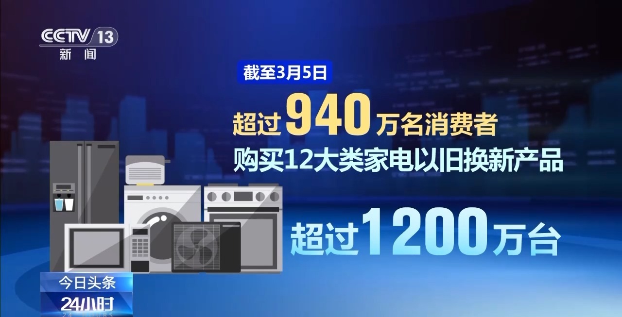 商務(wù)部數(shù)據(jù)顯示,截至3月5日,超過940萬名消費(fèi)者購買12大類家電以舊換新產(chǎn)品超過1200萬臺(tái),已有超過3400萬名消費(fèi)者申請了超過4200萬件手機(jī)等數(shù)碼產(chǎn)品購新補(bǔ)貼。