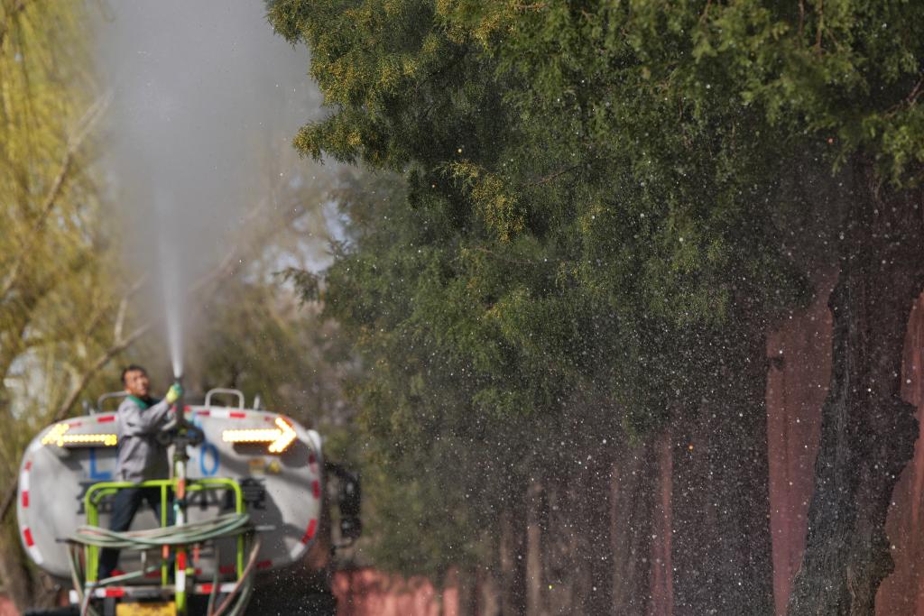 3月19日,北京園林工作人員操作高壓水槍,對圓柏進行沖淋。新華社記者 鞠煥宗 攝