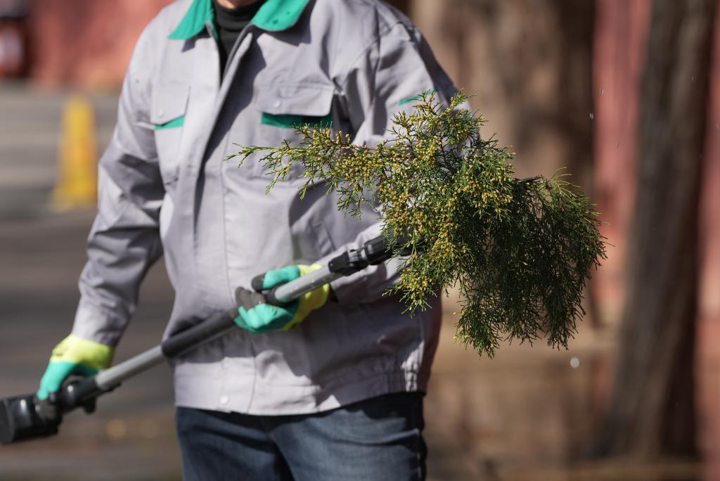 3月19日,北京園林工作人員對開花較多的圓柏枝條進行修剪。新華社記者 鞠煥宗 攝