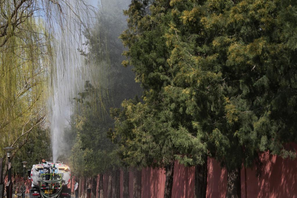 北京市園林綠化局科技處副處長張博說,為減少花粉對市民生活的困擾,園林部門正緊鑼密鼓降低花粉濃度,例如結合日常養(yǎng)護,采用修剪花枝、灑水噴淋、地面濕化等措施減少檜柏等樹種的花粉飄散量,及時清掃濕化后散落到地面上的花粉?!拔覀円蠊珗@等圓柏密度高的單位,下午1點到3點重點開展沖淋作業(yè)。”