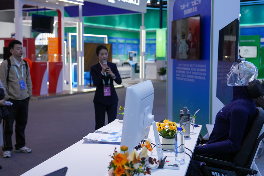 在中關(guān)村展示中心常設(shè)展內(nèi),參觀者在聽(tīng)取“北腦一號(hào)”“北腦二號(hào)”智能腦機(jī)系統(tǒng)介紹。新華社記者 鞠煥宗 攝
