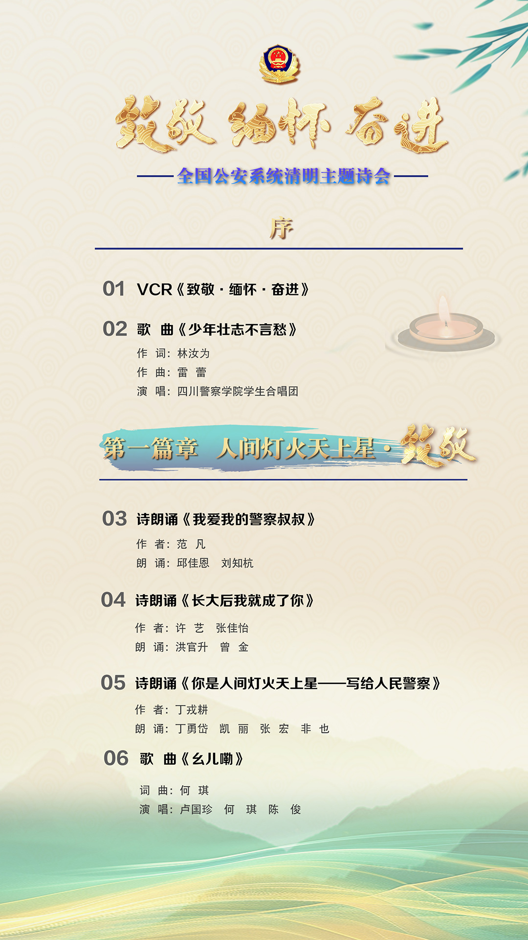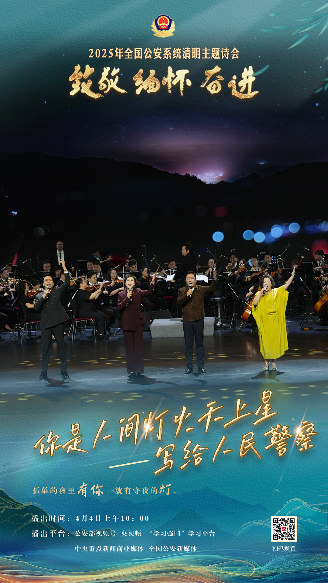 為充分展現全國公安機關和廣大公安民警、輔警時刻銘記習近平總書記的關心關懷,時刻為黨和人民而戰(zhàn)的忠誠政治本色,深情追憶一年來公安系統涌現的英雄模范感人事跡,激勵引導廣大公安民警以更加奮發(fā)有為的精神面貌,堅決履行好黨和人民賦予的神圣職責使命,今年清明節(jié)當天,公安部新聞宣傳局、全國公安文聯、四川省公安廳聯合舉辦“致敬·緬懷·奮進”2025年全國公安系統清明主題詩會。