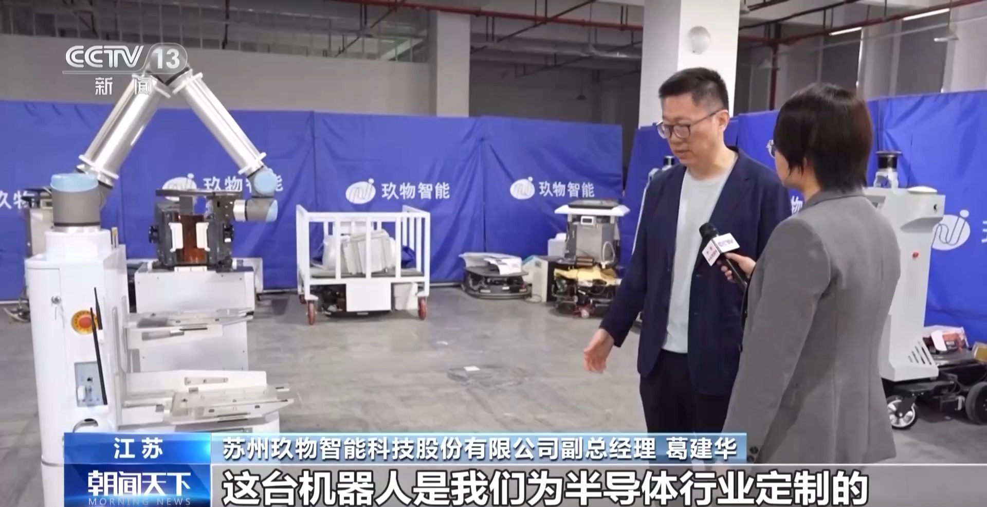蘇州玖物智能科技股份有限公司副總經(jīng)理 葛建華:這臺機器人是我們?yōu)榘雽?dǎo)體行業(yè)定制的。我們現(xiàn)在抓取的這個設(shè)備,其實是一臺晶圓盒,這個晶圓片模型其實特別薄、特別脆,震動稍微厲害一點就會有裂痕,機械臂的精度可以達到0.1毫米。