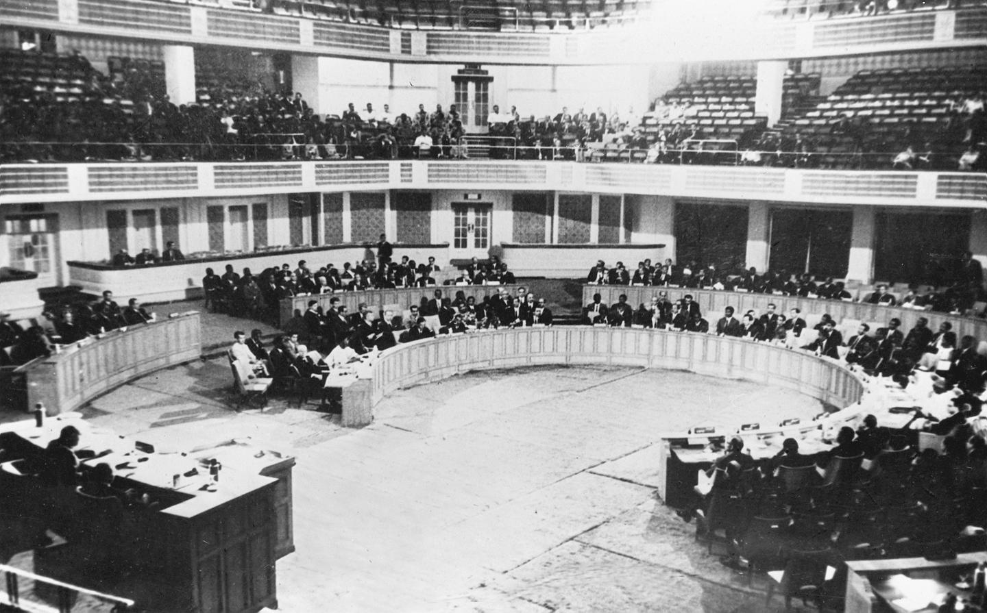 1955年4月18日至24日,29個亞非國家和地區(qū)的政府代表團在印度尼西亞萬隆召開亞非會議。圖為萬隆亞非會議會場內景。新華社記者錢嗣杰攝