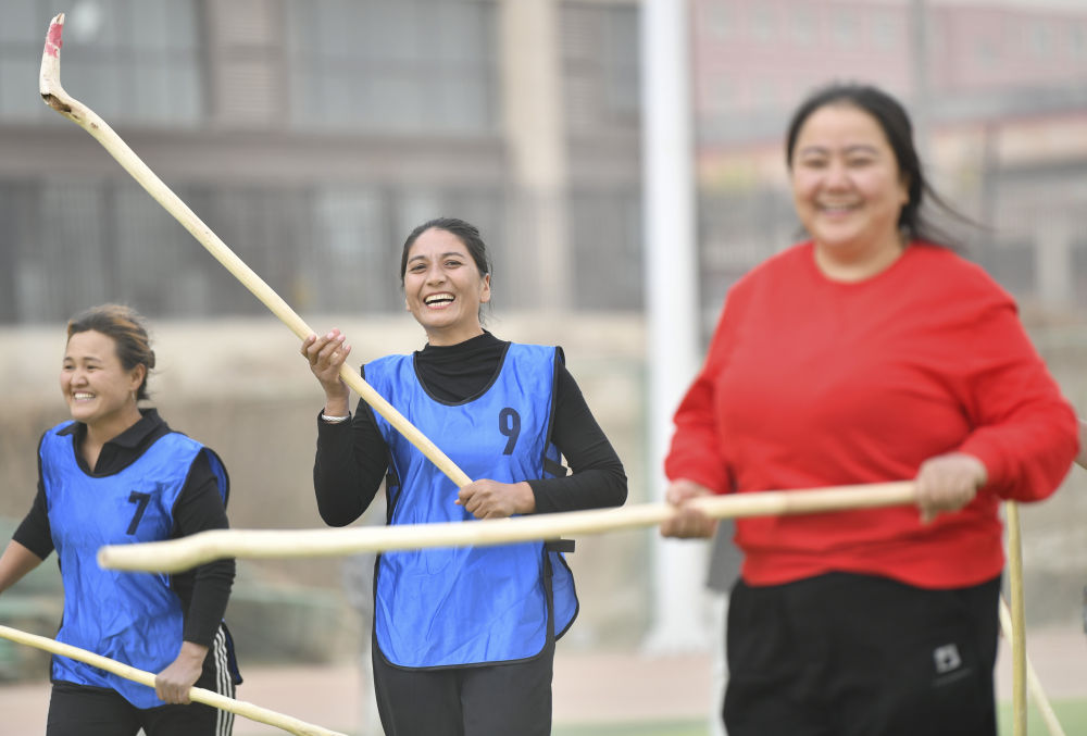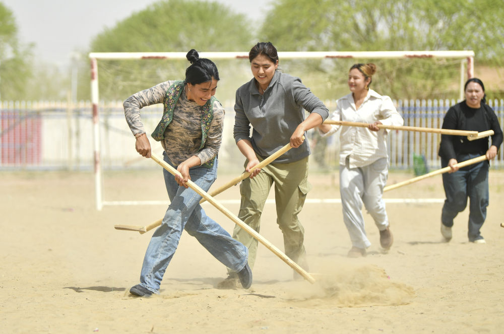 39歲的阿依古麗·買托合提是球隊(duì)里最年長的隊(duì)員。她身穿皮衣、腳踏休閑鞋,奔跑在正午驕陽下,屢屢揮動(dòng)球桿,拼搶也毫不遜色。一起訓(xùn)練的隊(duì)友有人穿著牛仔褲,有人穿著襯衫,還有人穿著后跟略高的鞋子。紅色的球洞穿由兩個(gè)塑料水瓶組成的球門,得分的一方歡呼不已,失球的隊(duì)員則懊惱地擦去臉上的沙塵。