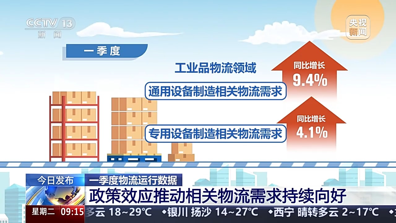 政策效應持續(xù)顯現(xiàn),大規(guī)模設備更新、消費品以舊換新政策推動相關(guān)物流需求持續(xù)向好。一季度,工業(yè)品物流領(lǐng)域的通用設備、專用設備制造相關(guān)物流需求,同比分別增長9.4%、4.1%;民生消費領(lǐng)域的通信器材類、家用電器和音像器材類、家具類商品零售相關(guān)物流需求同比分別增長26.9%、19.3%和18.1%。