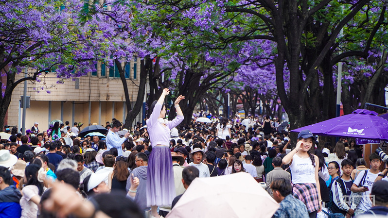 “五一”假期,前來昆明教場(chǎng)中路觀賞藍(lán)花楹的游客絡(luò)繹不絕(央廣網(wǎng)記者 魏文青 攝)