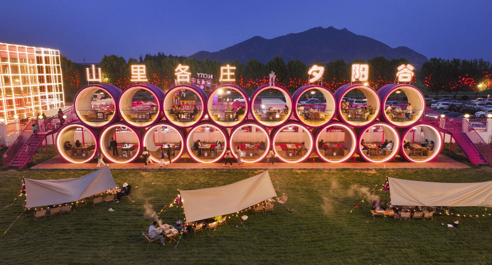 5月5日,游客在河北省遵化市夕陽谷景區(qū)游玩時品嘗美食(無人機(jī)照片)。