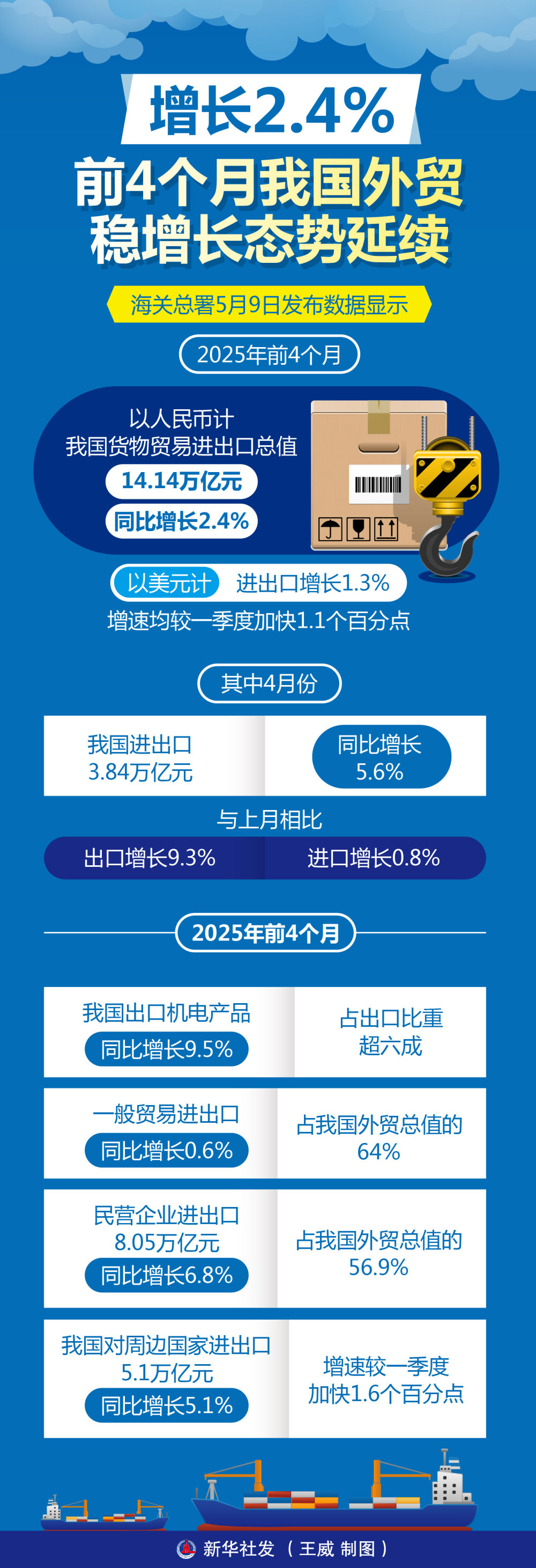 海關(guān)總署5月9日發(fā)布數(shù)據(jù)顯示,2025年前4個(gè)月,以人民幣計(jì),我國貨物貿(mào)易進(jìn)出口總值14.14萬億元,同比增長2.4%,以美元計(jì),進(jìn)出口增長1.3%,增速均較一季度加快1.1個(gè)百分點(diǎn)。其中4月份,我國進(jìn)出口3.84萬億元,同比增長5.6%。與上月相比,雖出口同比增速高位小幅回落至9.3%,但進(jìn)口由降轉(zhuǎn)為增長0.8%。