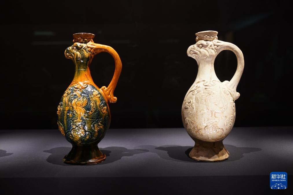 這是在展覽現(xiàn)場拍攝的故宮博物院藏唐代凸花鳳首壺(右)與舊金山亞洲藝術(shù)博物館藏鳳首壺(5月14日攝)。新華社 王申 攝