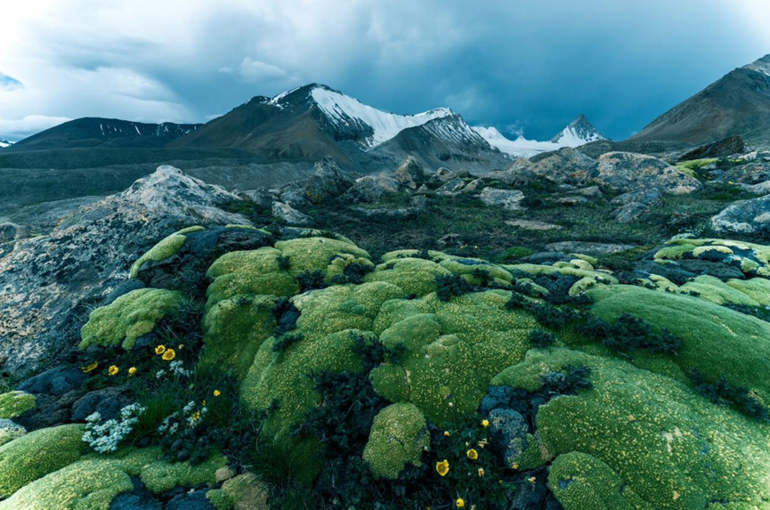 第二天一早,我們繼續(xù)向山脈的腹地去探索,前往冷布崗日腹地的道路也是無人踏足的,沒有正規(guī)車道的,所以我們同樣只能沿著牧民留下的車轍印前行。在一望無際的高原上,我們找不到路的時候就操縱無人機升空去探索路線。經(jīng)過了一整天的艱難探索,終于抵達了目的地,這個地方再往上走是完全沒有路了。在海拔約5800米左右的這個地方,不僅有巍峨壯美的雪山,還長著很多這種獨特的高山苔蘚,這種植被通常只分布在海拔4000米以上的地區(qū),極具地域特色。所以在拍攝時,我將這些高原特有的植被作為前景,既展現(xiàn)了高原生態(tài)風貌,也作為海拔高度的天然標識,然后遠處雄偉的冷布崗日雪山則構成了畫面的核心部分。