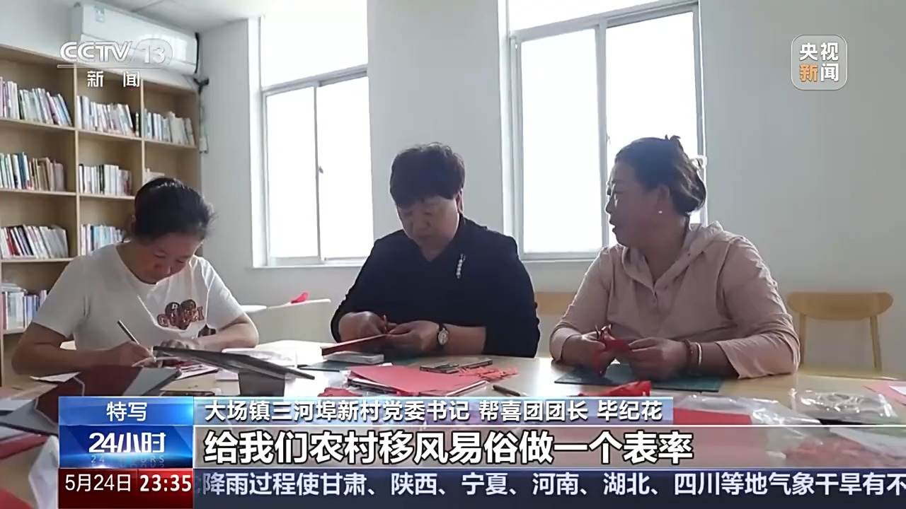 大場鎮(zhèn)三河埠新村黨委書記 幫喜團(tuán)團(tuán)長 畢紀(jì)花:剛開始的時候我們在一起剪紙,有一位大姐的兒子要結(jié)婚,我們當(dāng)時就給紀(jì)大姐做工作,說她完全可以成為第一個吃螃蟹的人,給我們農(nóng)村移風(fēng)易俗做一個表率。