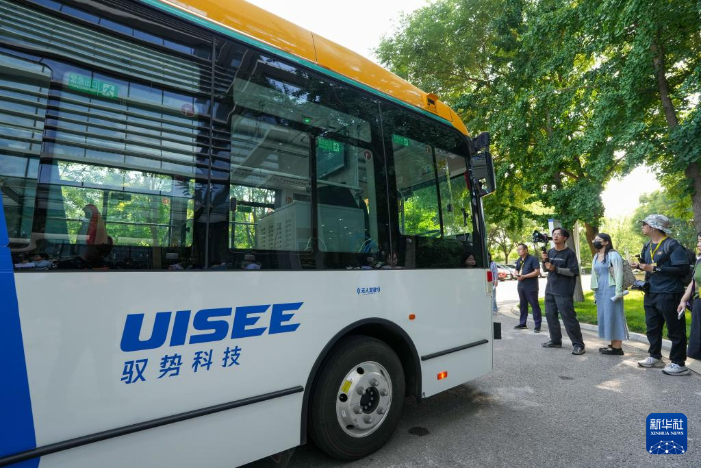 參觀者在體驗(yàn)北京馭勢(shì)科技的一款無(wú)人駕駛巴士(6月16日攝)。新華社記者 鞠煥宗 攝