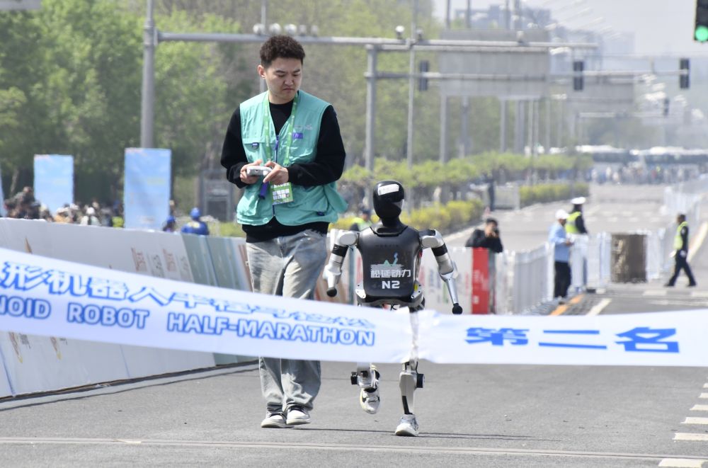 4月19日,在2025北京亦莊半程馬拉松暨人形機(jī)器人半程馬拉松比賽中,小頑童隊選手松延動力N2(右)沖向終點。新華社記者李欣 攝