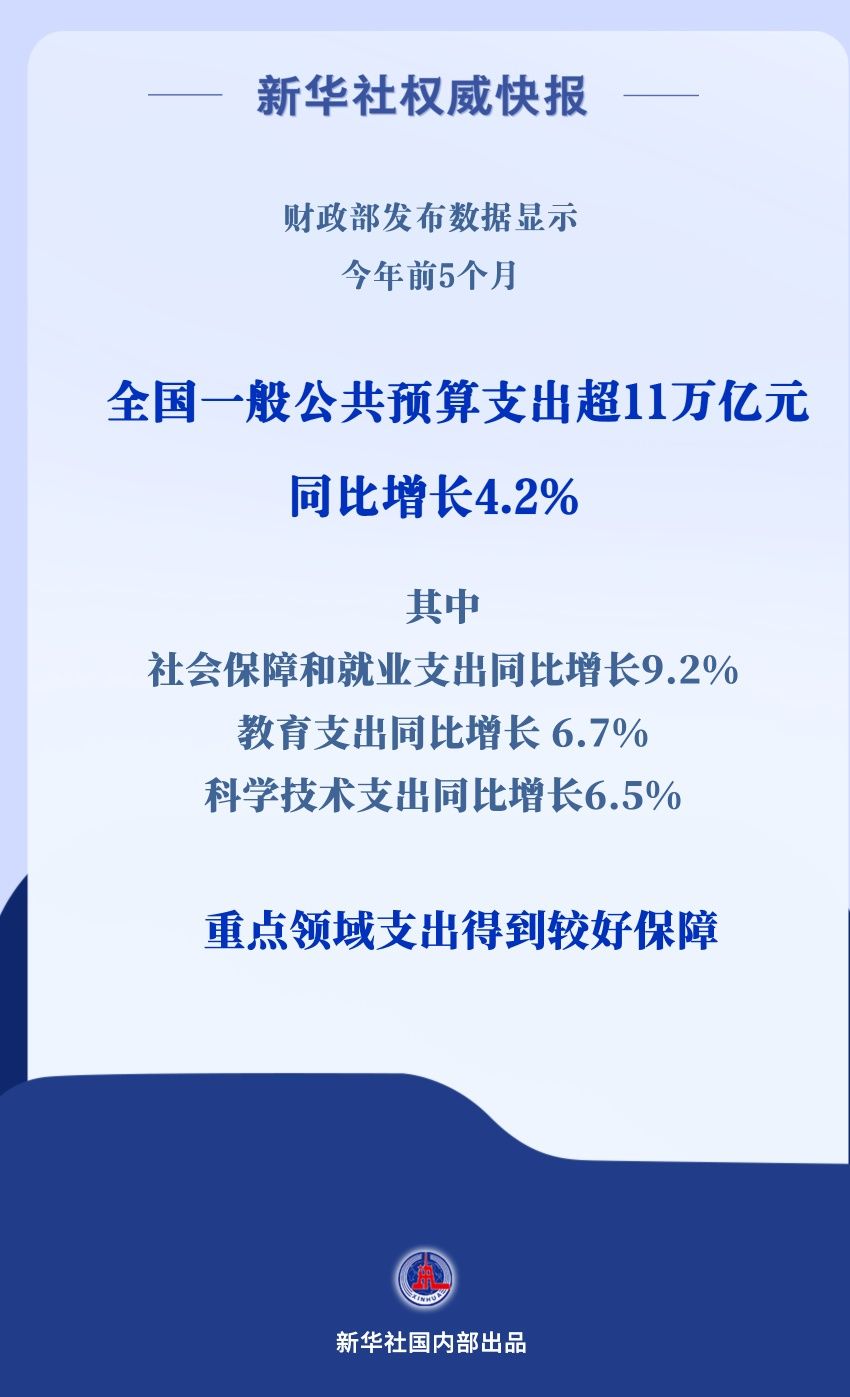 數(shù)據(jù)顯示,全國(guó)一般公共預(yù)算支出持續(xù)增長(zhǎng),前5個(gè)月達(dá)112953億元,同比增長(zhǎng)4.2%。各級(jí)財(cái)政部門(mén)加大支出強(qiáng)度,優(yōu)化支出結(jié)構(gòu),持續(xù)加強(qiáng)對(duì)重點(diǎn)領(lǐng)域的支出保障。