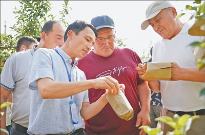 近日,2025年首期中國—中亞五國職業(yè)農(nóng)民培訓班在陜西渭南開班。圖為學員們在西北農(nóng)林科技大學蘋果試驗站了解蘋果套袋知識。