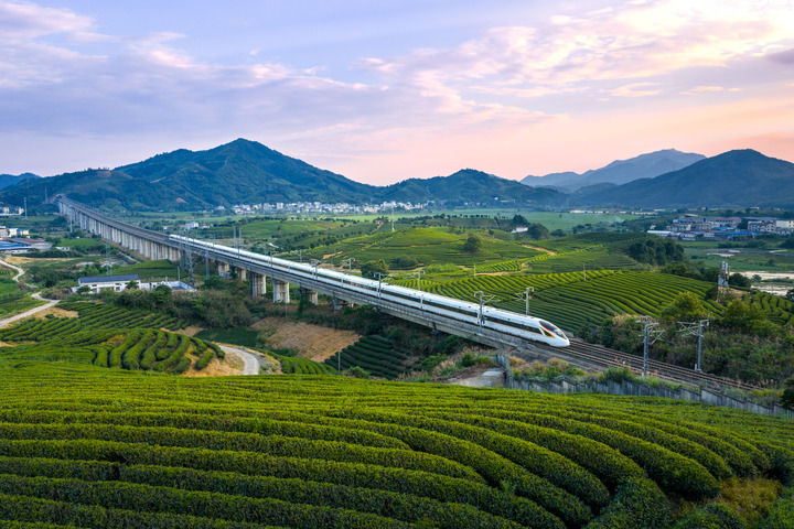 6月6日,復(fù)興號(hào)動(dòng)車組經(jīng)過福建武夷山境內(nèi)的合福高鐵南岸特大橋。(該圖片由中國鐵路南昌局集團(tuán)有限公司提供)