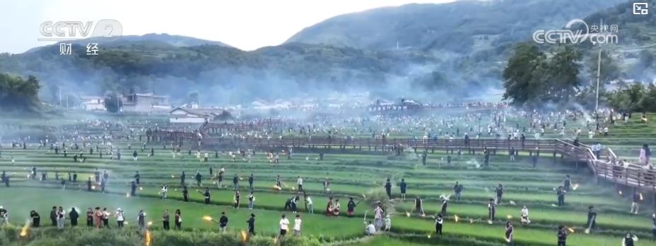 在越西縣,夏季避暑暨火把季系列活動(dòng)也輪番上演。除了有精美絕倫的非遺巡游,和極具視覺(jué)沖擊力的彝族傳統(tǒng)競(jìng)技,在越西縣普雄鎮(zhèn)陽(yáng)坡村的梯田上,一場(chǎng)原生態(tài)稻田火把秀更是吸引數(shù)以千計(jì)的游客前來(lái)。大家跟隨當(dāng)?shù)鼐用裨诘咎镩g點(diǎn)燃火把,用火焰驅(qū)逐害蟲(chóng)。游客們手中的火把與稻田連成一片,場(chǎng)面蔚為壯觀。