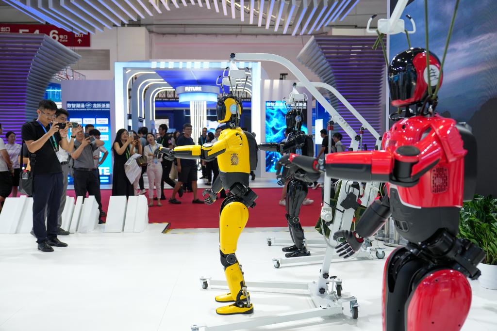 7月17日,在第三屆鏈博會(huì)數(shù)字科技鏈展區(qū),參觀者觀看人形機(jī)器人表演。新華社記者 鞠煥宗 攝