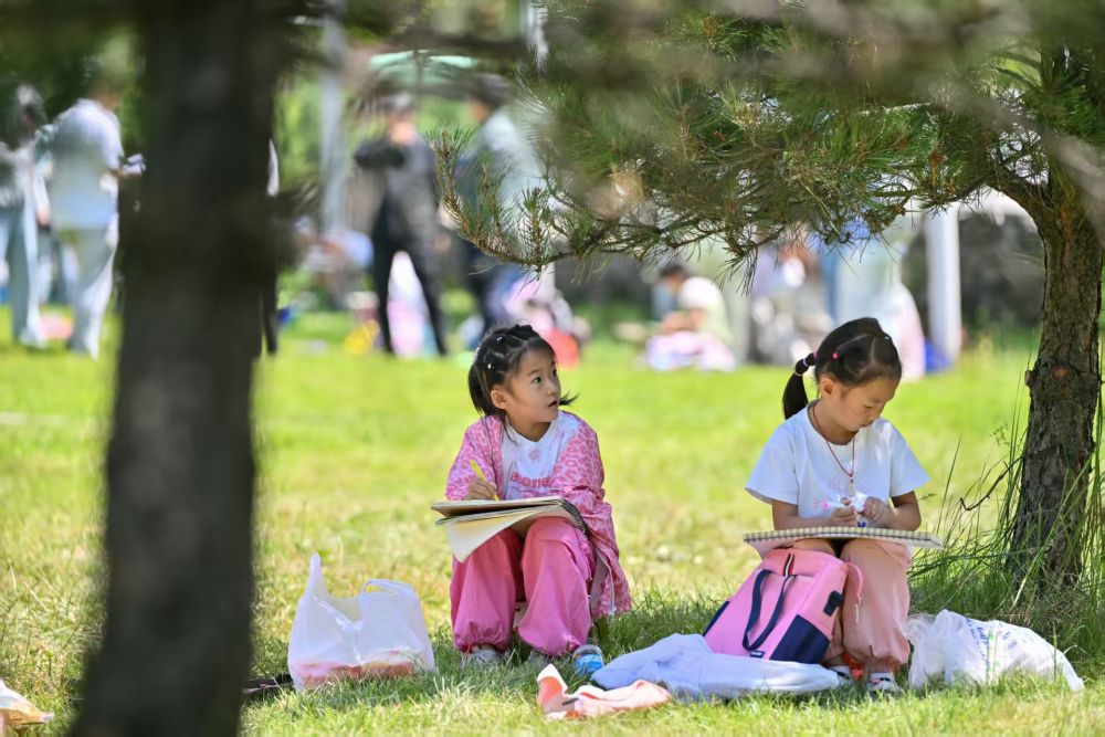 7月22日,兩名小學生在青海省大通縣邊麻溝花海景區(qū)內(nèi)參加暑期美術寫生研學活動。新華社記者 孫瑞博 攝