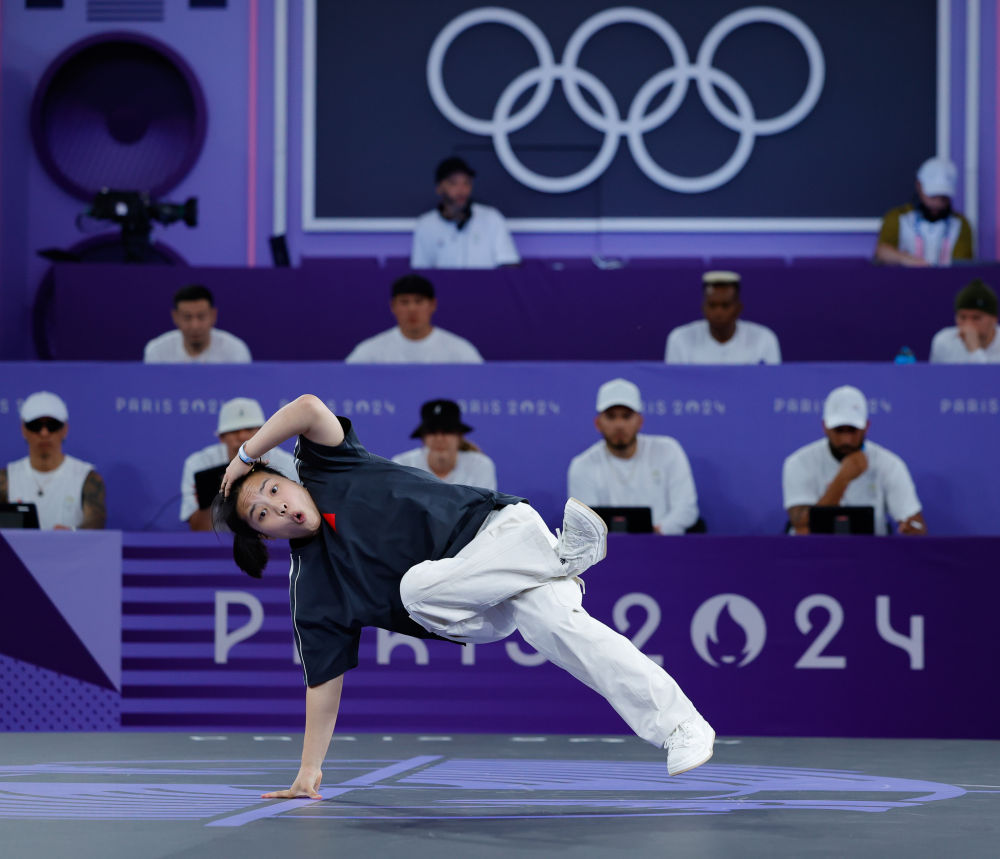 巴黎奧運(yùn)會(huì)霹靂舞女子組比賽,中國選手曾瑩瑩在比賽中。新華社記者 徐子鑒 攝