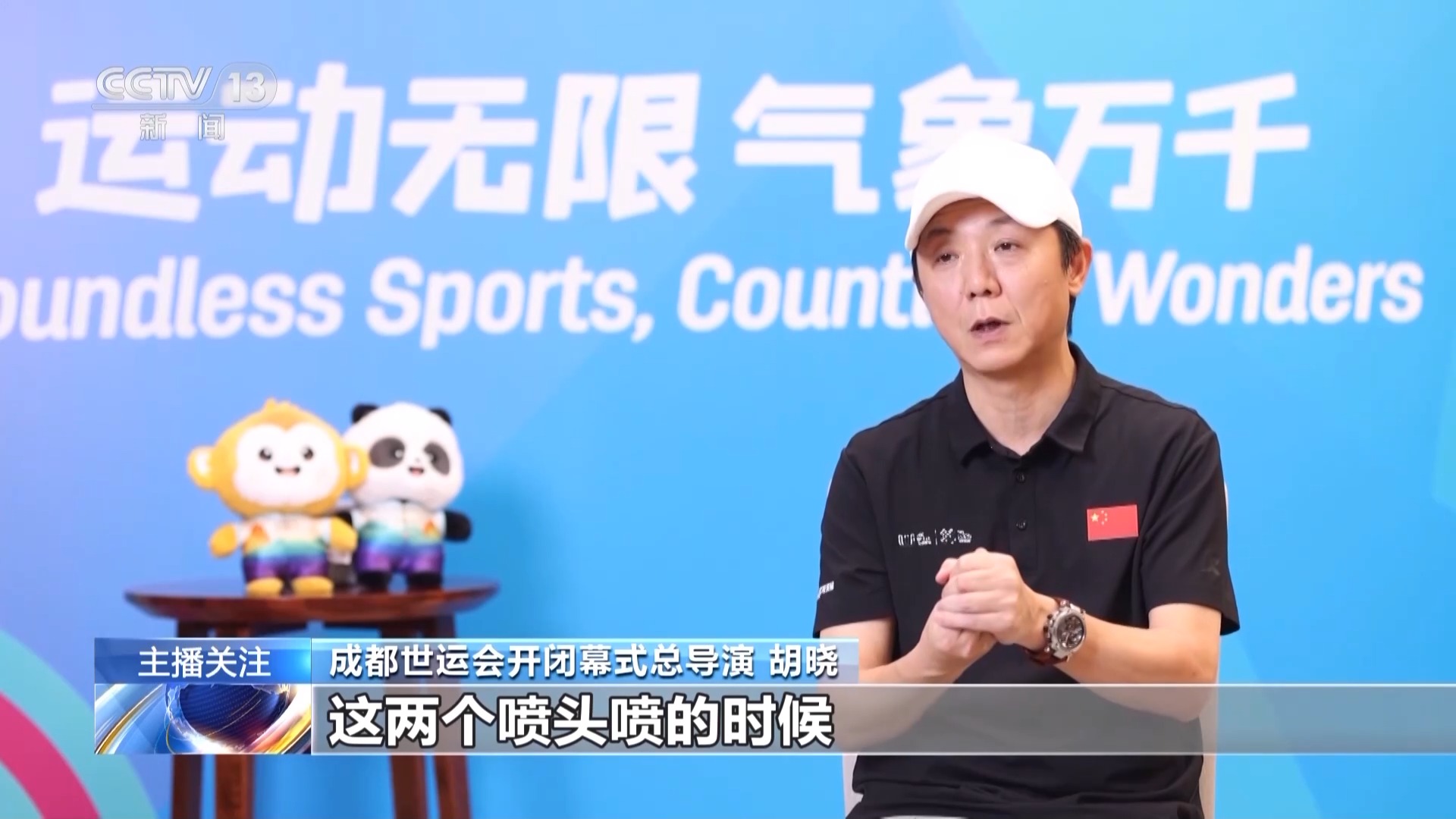 成都世運(yùn)會(huì)開閉幕式總導(dǎo)演 胡曉:乍一看都以為是里面加了個(gè)燃?xì)夤艿?。不是,它真的把天然氣融到水里去了。它是外面一根水管,里面一根氣管,這兩個(gè)噴頭噴的時(shí)候,外面的水管因?yàn)樗膲毫芫鶆颍易銐虼?,可以形成一個(gè)管壁,變成一個(gè)天然氣管道,氣就從里面出來了,而這個(gè)氣又不能太大,太大了他又把水管壁給沖破了,太小了,又沖不上去,就要找到一個(gè)水與火之間的平衡,然后在最后點(diǎn)著的瞬間,水跟火都能融到一起去燃燒,去綻放,一個(gè)噴起來,一個(gè)燃燒起來。