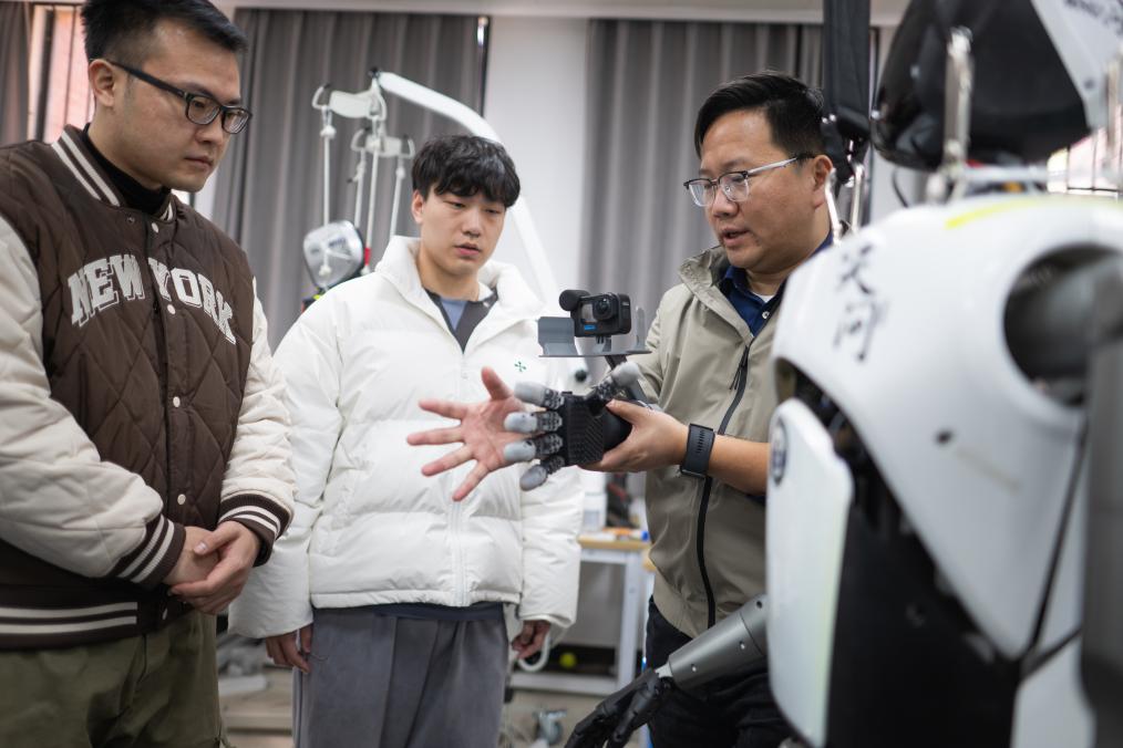 武漢大學(xué)研發(fā)團(tuán)隊(duì)在對“天問”人形機(jī)器人進(jìn)行調(diào)試。新華社記者肖藝九 攝