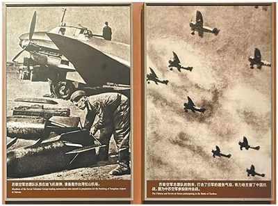 中國人民抗日戰(zhàn)爭紀(jì)念館中展示的蘇聯(lián)援華航空隊老照片。左側(cè)照片為蘇聯(lián)援華航空隊成員為飛機(jī)裝彈,準(zhǔn)備轟炸被日軍占領(lǐng)的臺北松山機(jī)場。右側(cè)照片為1938年中蘇空軍參加徐州會戰(zhàn)。