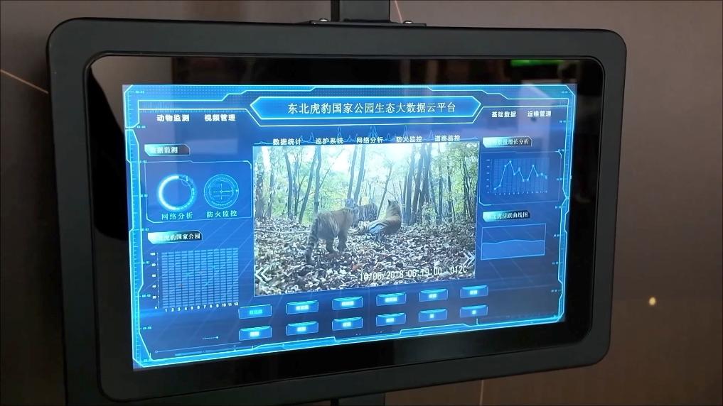 在吉林省琿春東北虎豹自然科普館,東北虎豹國(guó)家公園的“天空地一體化監(jiān)測(cè)體系”通過(guò)智能紅外相機(jī)、衛(wèi)星遙感、無(wú)人機(jī)等技術(shù),回傳野生動(dòng)物活動(dòng)影像。
