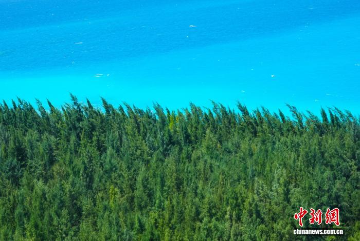 這是2025年6月29日在南海某島礁拍攝到的畫面,礁上茂密的綠色植被取代了原本白茫茫的礁砂,與周邊蔚藍色海面形成鮮明對比。 張大禹 攝