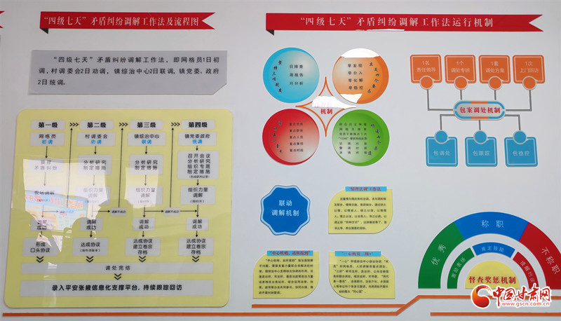 網格員初調:手持終端“一鍵上報”,1天內就地化解;村調委會勸調:鄉(xiāng)賢、“三官一師”齊上陣,2天內情理交融;鎮(zhèn)綜治中心聯(lián)調:“中心吹哨、部門報到”,2天內集中“會診”;鎮(zhèn)黨委政府統(tǒng)調:專班下沉、縣直聯(lián)動,2天內“案結事了”。