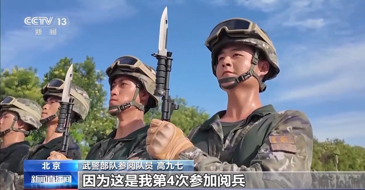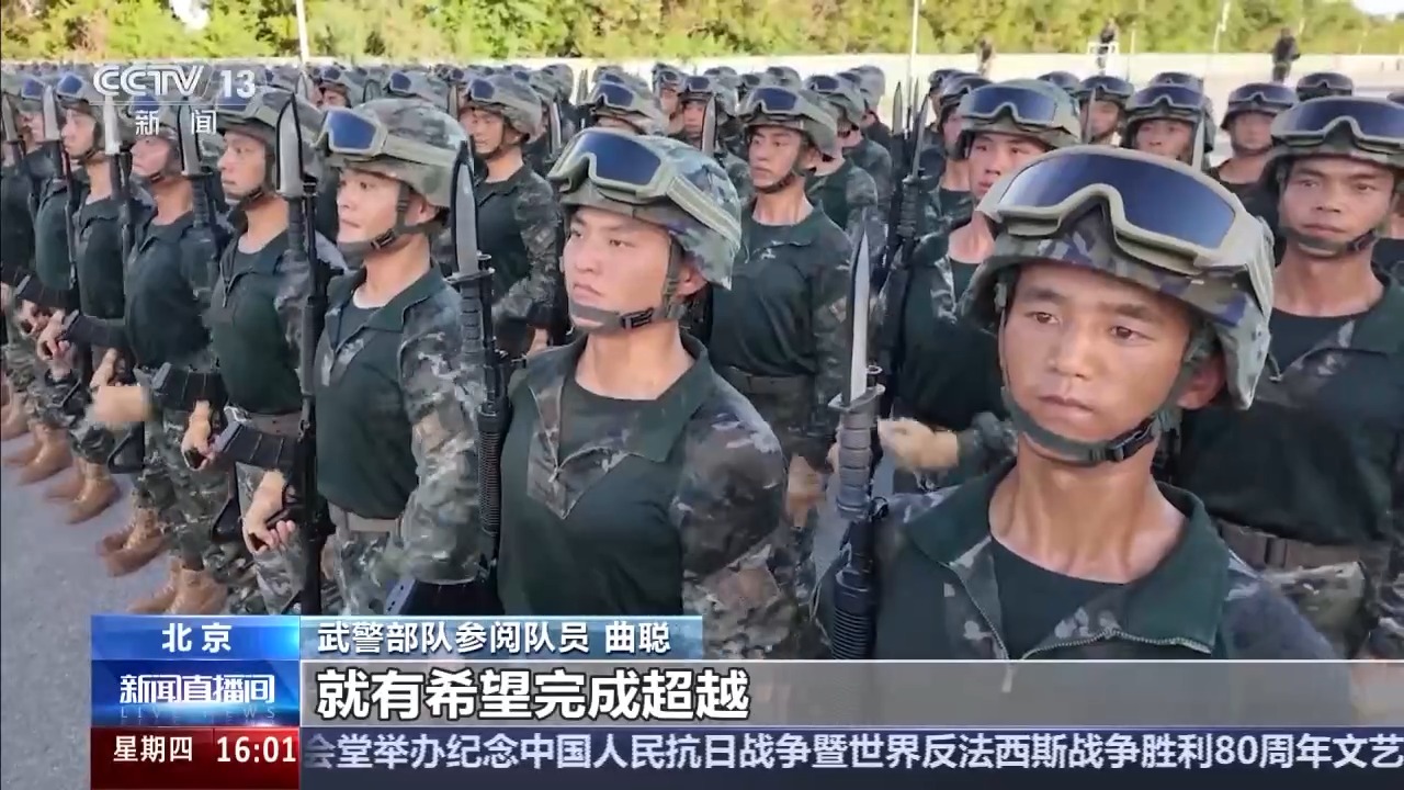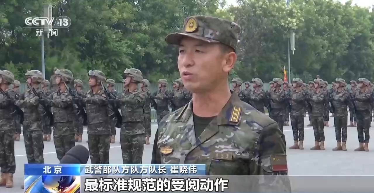 武警部隊方隊方隊長 崔曉偉:目前我們已經(jīng)進入最后的沖刺階段,在紀念抗戰(zhàn)勝利80周年紀念日當天,以最昂揚的精神狀態(tài)、最標準規(guī)范的受閱動作,光榮地接受黨和人民檢閱,接受習主席檢閱。