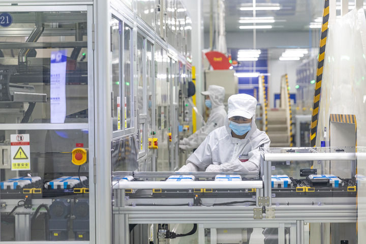 2024年9月27日,在位于重慶市銅梁區(qū)的海辰儲(chǔ)能重慶制造基地,工作人員在生產(chǎn)線上初步檢測(cè)兩個(gè)電芯是否配對(duì)。