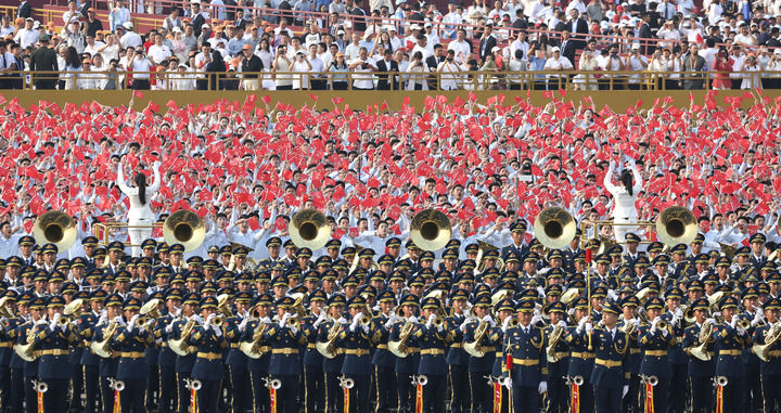 ↑9月3日,紀(jì)念中國人民抗日戰(zhàn)爭暨世界反法西斯戰(zhàn)爭勝利80周年大會在北京隆重舉行。這是中國人民解放軍聯(lián)合軍樂團(tuán)和合唱團(tuán)。新華社記者 劉衛(wèi)兵 攝