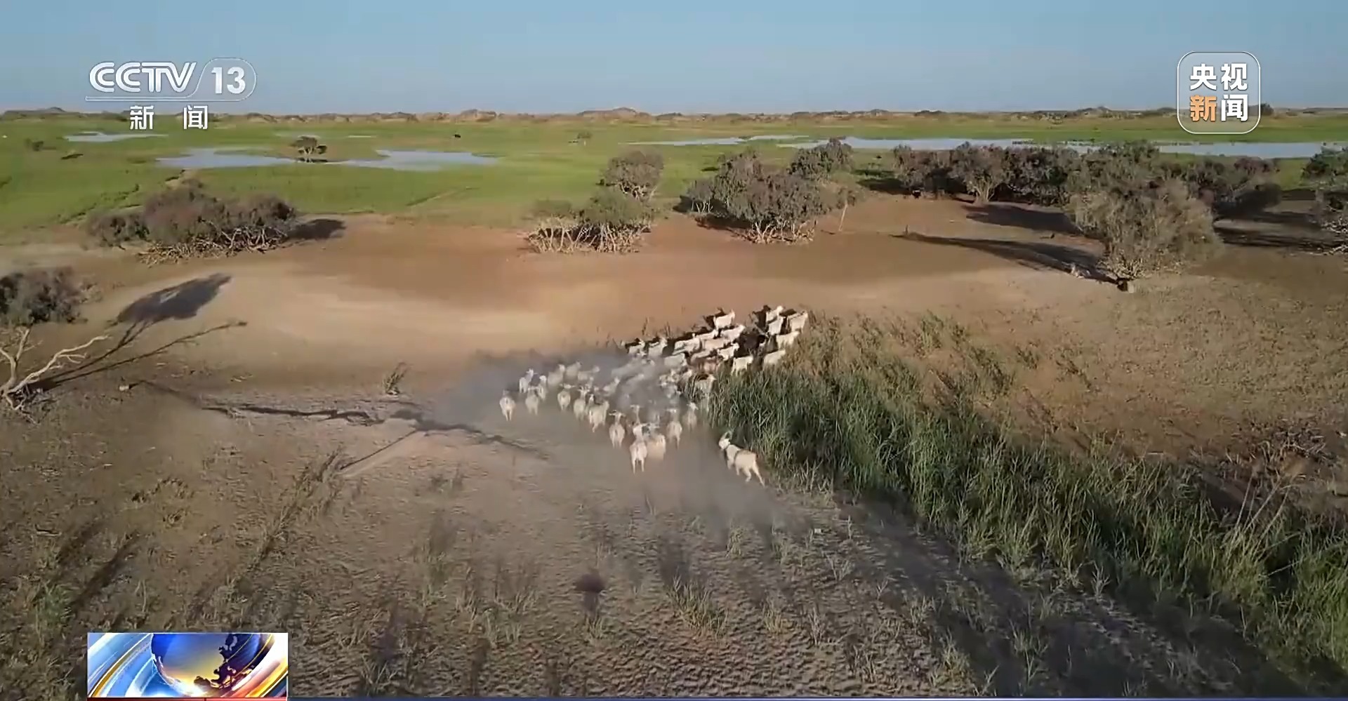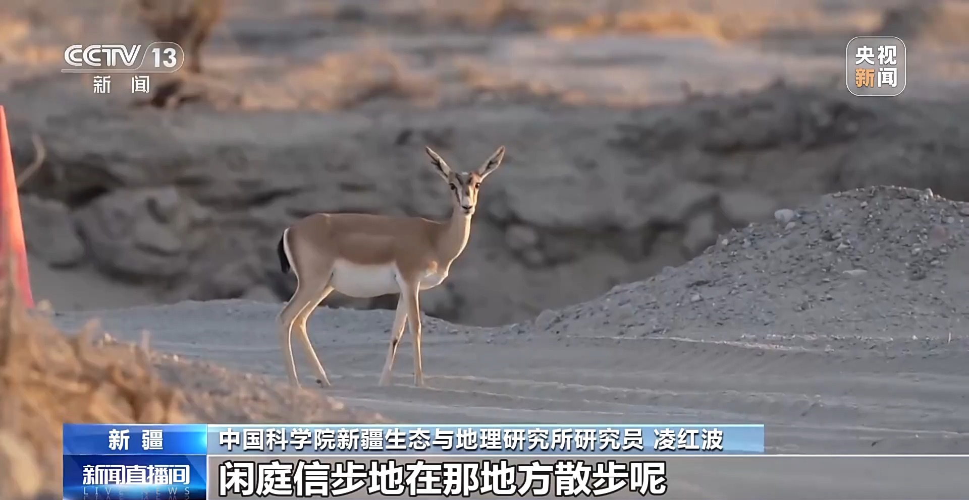 中國(guó)科學(xué)院新疆生態(tài)與地理研究所研究員 凌紅波:黃羊不怕人了,閑庭信步地在那兒散步呢。這就是人與自然和諧相處。