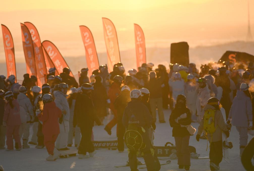 日落時(shí)分,阿勒泰市將軍山國際滑雪度假區(qū)的山頂區(qū)域人頭攢動(dòng)(2025年1月24日攝)。新華社記者 胡虎虎 攝