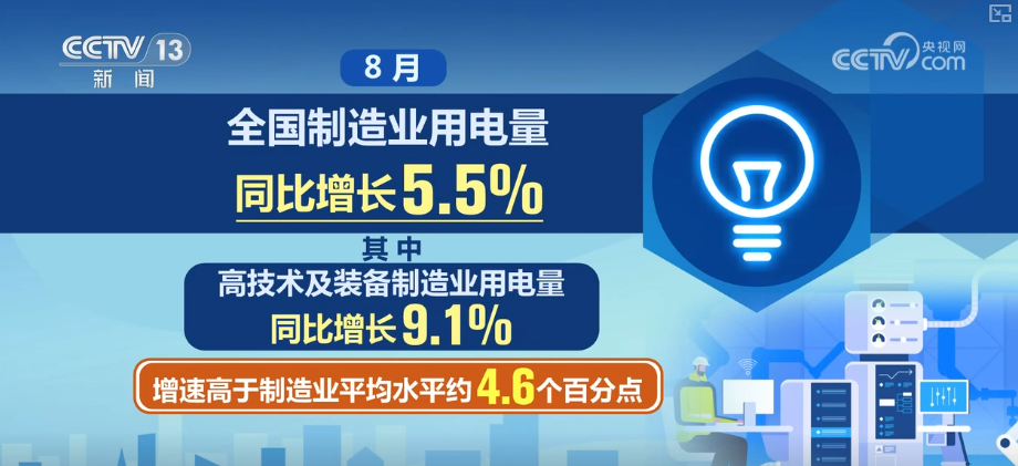 數(shù)據(jù)顯示,8月,全國制造業(yè)用電量同比增長5.5%。其中,高技術及裝備制造業(yè)用電量同比增長9.1%,增速高于制造業(yè)平均水平約4.6個百分點。