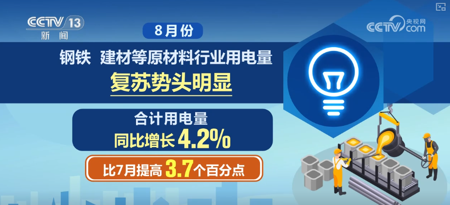 除了制造業(yè),8月份,鋼鐵、建材等原材料行業(yè)用電量復蘇勢頭明顯,合計用電量同比增長4.2%,比7月提高3.7個百分點。