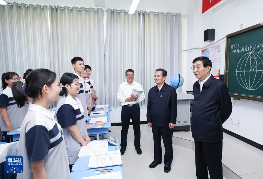 9月25日下午,受習(xí)近平總書(shū)記囑托,中共中央政治局常委、全國(guó)政協(xié)主席、中央代表團(tuán)團(tuán)長(zhǎng)王滬寧帶領(lǐng)中央代表團(tuán)部分成員在巴音郭楞蒙古自治州庫(kù)爾勒市看望慰問(wèn)當(dāng)?shù)馗髯甯刹咳罕?。這是王滬寧和中央代表團(tuán)部分成員在庫(kù)爾勒市第二十三中學(xué)考察教育援疆情況。新華社記者 姚大偉 攝