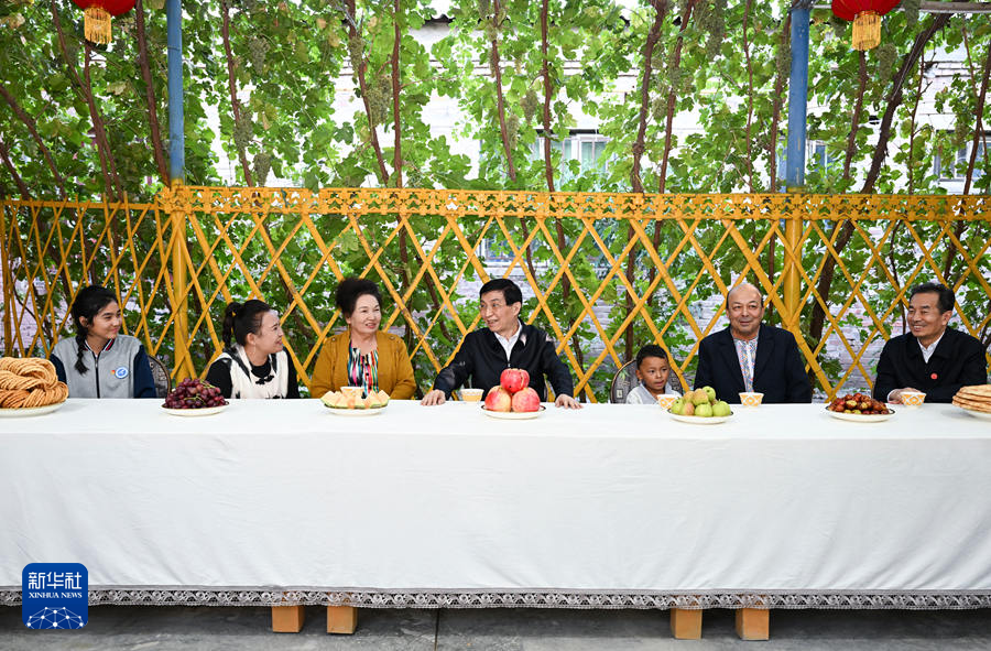9月25日下午,受習(xí)近平總書(shū)記囑托,中共中央政治局常委、全國(guó)政協(xié)主席、中央代表團(tuán)團(tuán)長(zhǎng)王滬寧帶領(lǐng)中央代表團(tuán)部分成員在巴音郭楞蒙古自治州庫(kù)爾勒市看望慰問(wèn)當(dāng)?shù)馗髯甯刹咳罕?。這是王滬寧和中央代表團(tuán)部分成員在庫(kù)爾勒市阿瓦提鄉(xiāng)吾夏克鐵熱克村了解鄉(xiāng)村產(chǎn)業(yè)發(fā)展和群眾生產(chǎn)生活情況。新華社記者 張領(lǐng) 攝