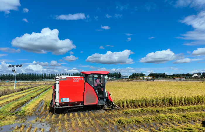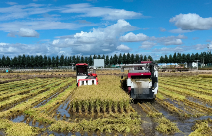 2025年9月9日,農(nóng)戶在內(nèi)蒙古興安盟扎賚特旗好力保鎮(zhèn)古廟村稻田里搶收青糧。(扎賚特旗融媒體中心供圖)