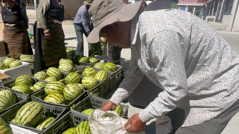 9月,在西藏日喀則市桑珠孜區(qū)年木鄉(xiāng)羅林村,曬場(chǎng)上一派繁忙景象。村民們排起隊(duì)伍,與收購人員并肩協(xié)作,將一個(gè)個(gè)圓滾滾的大西瓜挨個(gè)過秤、裝車,7000斤西瓜被一次性收購。