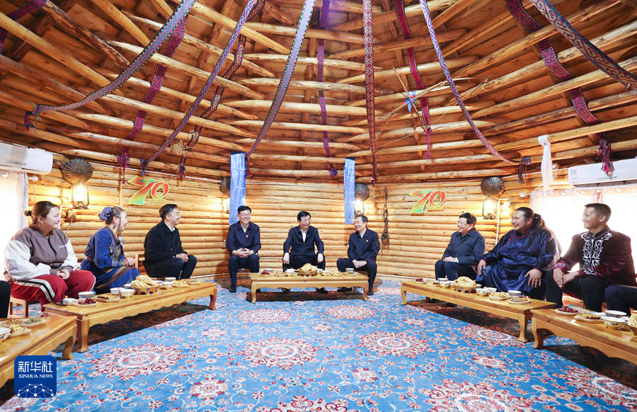 9月27日,受習(xí)近平總書記囑托,中共中央政治局常委、全國政協(xié)主席、中央代表團團長王滬寧帶領(lǐng)中央代表團部分成員到阿勒泰地區(qū)布爾津縣考察。這是王滬寧和中央代表團部分成員在扎拉特鄉(xiāng)村旅游專業(yè)合作社同村民交流。新華社記者 姚大偉 攝