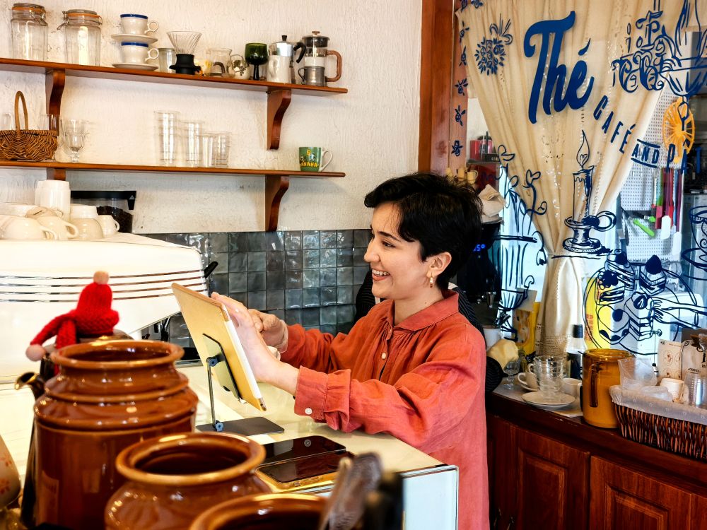 9月18日,烏魯木齊市“一個咖啡店”老板耐菲絲·地力夏提在為顧客點單。新華社記者 賀小童 攝