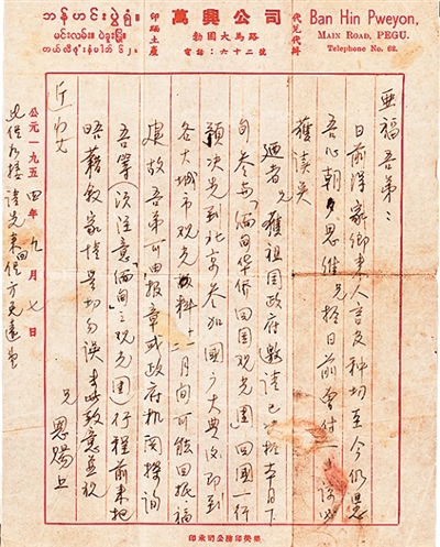 廼者兄獲祖國政府邀請,已決于本月下旬參與“緬甸華僑回國觀光團(tuán)”回國一行,預(yù)決先到北京參加國慶大典,后即到各大城市觀光,料十一二月間可能回抵福建,故吾弟可由報章或政府機(jī)關(guān)探詢吾等(須注意“緬甸”之觀光團(tuán))行程,前來把晤,藉敘家情,是切勿誤。