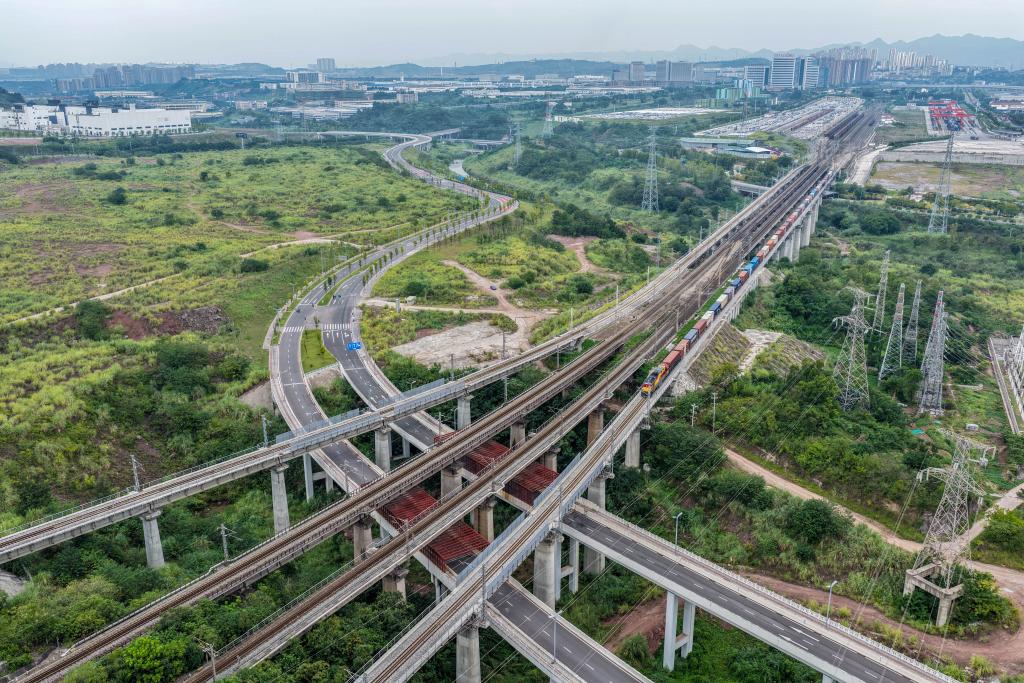 9月28日,西部陸海新通道班列在重慶魚嘴站順利發(fā)車(無人機(jī)照片)新華社記者 唐奕 攝